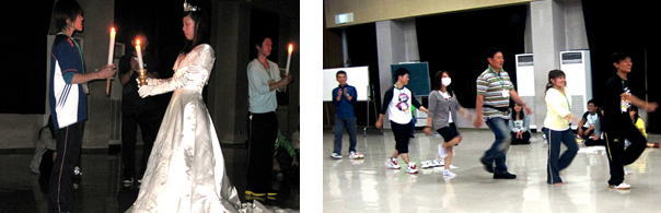 | 第1部で火を迎える儀式、第2部でレクリエーション、第3部で火を送る儀式を行いました。第1部と第3部は粛々と進行され、第2部はゲームのほか、ギターの伴奏による歌など、趣向を凝らしたキャンドルのつどいになりました。 |