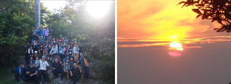 4日目は早朝登山をしました。真夜中の午前2時30分に出発し、真っ暗な山道をヘッドライトや懐中電灯の明かりを頼りに歩いていきました。奉幣殿ではライトを消して天の川を見ることができました。本当にきれいでみんな感動していました。途中,険しい山道もありましたが,「みんな元気~!元気!元気!」と声をかけ合い励ましあいながら登頂を果たしました。山頂は素晴らしい天気に恵まれ,ひこさんチャレンジキャンプ史上初の日の出を見ることができました。あの素晴らしい光景はみんなの目に焼きついたことと思います。日の出を見ることを目標にがんばってきたが,それよりも中元寺公民館から英彦山の山頂まで約30kmを歩きとおしたみんなの表情は自信に満ち溢れていました。また,全員で協力して登山を成功させたことで大きな達成感を得られ,同時に仲間の存在のありがたさを感じることができました。