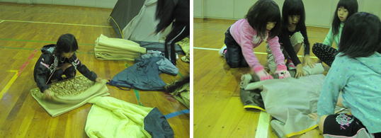 最終日、起床後すぐにテントや毛布、シュラフの片付けを行いました。「自分のことは自分でする」を目標に、スタッフの支援を受けながら、一年生も自分で片付けを行いました。