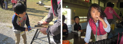 その後、杉の木を使ったクラフト作りを行い、各自が笛を制作しました。初めて使うノコギリも、スタッフの指導を得て、ケガなく使いこなすことができました。自分で作った笛から音が出た時の子ども達の顔は輝いていました。
