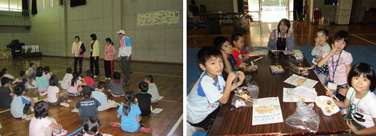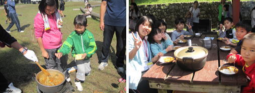 最後の活動はカレーライス作りでした。「お家の人に作ってあげよう」の合言葉のもと、全員がそれぞれの役割に取り組みました。包丁を扱うのも3日目になり、上手に使えるようになりました。料理の手際が良くなっていました。完成したカレーを保護者に振る舞う時の子どもたちの表情はとても得意げでした。