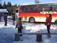 子どもたちは、小倉駅・直方駅・博多駅・久留米駅などに集合し、JR電車を利用して新飯塚駅または原田駅まで移動しました。そして、そこからは貸し切りバスに乗り換えて英彦山青年の家を目指しました。英彦山を登り始めてしばらくすると車窓に雪景色が見え隠れし、子どもたちからは歓声があがりました。