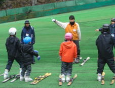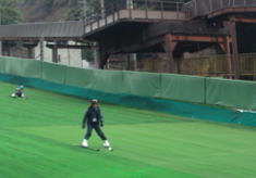 会場をサンビレッジ茜に移動して、「人工芝スキー体験」です。