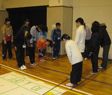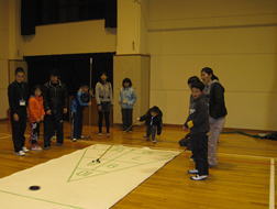 スキーの疲れも見られましたが、プレイホールで「シャフルボードゲーム」を楽しみました。このゲームは、得点圏にディスクをスティックでシュートして得点を競う、一種の陣取りゲームです。グループ対抗で行い、見ている子どもたちも応援に熱くなっていました。