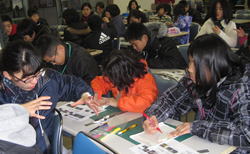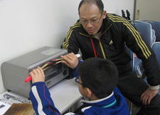 プラ板に自分の好きな絵をかいて、オーブンで加熱して絵を定着させ、キーホルダー(プラホビー)を作りました。サンプル作品を見ながら、オーブンで加熱したときの縮み加減を考えながら、バランスよく絵をかいていました。出来上がった作品を見て微笑む様子が印象的でした。