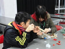 夕食の後は、クリスマスリース作りをしました。ドーナツ状のダンボールにモールや綿、リボンや松ぼっくりなどを付け、自分だけのリースを作りました。