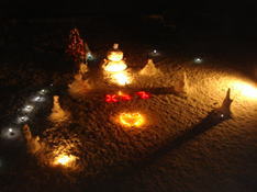 リースが完成した子どもたちには、サプライズが待っていました。窓の外を見てみると、昼間に作った雪だるまが特性クリスマスツリーと一緒にライトアップされ、手元のリースとともに聖夜のすてきな思い出になりました。