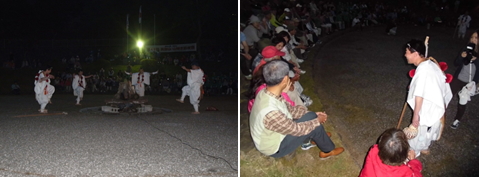 1日目は、英彦山青年の家で「出会いのつどい」を行った後、添田町主催「英彦山山開き前夜祭」に参加しました。当日は晴天に恵まれ、前夜祭恒例の「まさかり舞い」や青年の家職員による「山伏問答」、「彦山踊り」などの出し物を楽しみました。また、参加者全員で炭坑節を踊るなど、大変な盛り上がりをみせました。