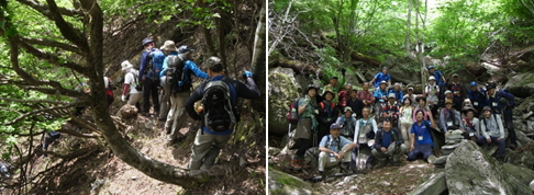| 英彦山の裏を通るこのコースで、20名の参加者がありました。中岳からケルンの谷に下った後に広がる英彦山の裏側の景色を初めて見る参加者からは、感動の声があがりました。 |