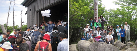 | 途中まで傾斜が急ですが、頂上に近づくにつれて、とても見晴らしがよくなる北西尾根を通るコースです。当日は、17名の参加があり、中岳上宮では山開きが行われました。 |