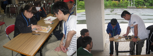 最後の研修として、英彦山将棋の製作を行いました。4種類の駒を製作した後、実際に将棋の対戦を行いました。対戦後、子どもに指導する時の安全面や指導法について考えました。様々な意見をもとに実践編として「英彦山森林環境ボランティアⅠ」の参加者(小学生)に対し、英彦山将棋の製作指導を行いました。