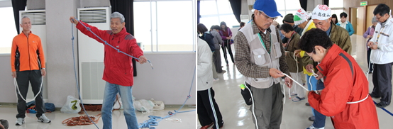 | 日本体育協会公認山岳マスター上級コーチの園川陽造氏と、日本山岳会北九州支部縄手修氏に「ロープワーク体験」について講習していただきました。「もやい結び」「本結び」「いのちづな結び」を教えていただき、参加者に実際に体験していただきました。参加者は、最初は悪戦苦闘しながらもロープワークを習得していきました。 |