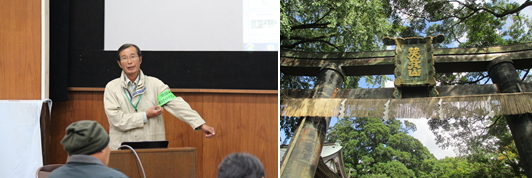 | 添田町観光ガイドボランティア早田利光氏に「英彦山の自然と歴史」について、講話していただきました。英彦山の名前の由来や、表参道の史跡や建造物について詳しく説明していただきました。また、英彦山に植生する草花についても説明していただきました。参加者は、英彦山のすばらしさを改めて感じていました。 |
