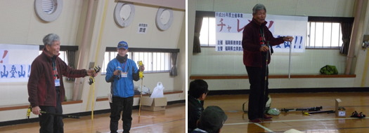 | 園川陽造氏による、登山道具の正しい使い方についての講話を行いました。参加者は、アイゼンの種類や滑落時のピッケルの使い方などを熱心に学んでいました。 |