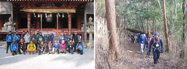 | 講話の後は、二つのグループに別れ、翌日の登山本番に備えて、英彦山青年の家までの歩行訓練を行いました。あいにく、雪は積もっていませんでしたが、参加者は澄んだ空気の中、山道を歩いて、翌日の登山に備えました。途中、たくさんのシカの出迎えを受け、参加者からは驚きの声が上がっていました。 |
