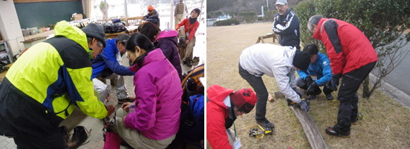 | 二日目は、冬山の未経験者やアイゼンの使用に慣れていない参加者を対象に、アイゼンの着脱の仕方や歩行訓練を行いました。 |