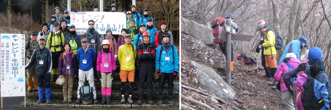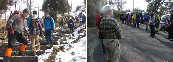 | 登山当日の天気は晴れ。参加者は、入念なストレッチを行い、グループごとに冬山登山に出発しました。 |