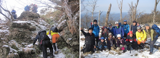 | アイゼンを着けた参加者は、安全に気を着けながら岩場を登っていきました。凍った場所や動きやすくなった岩などを見つけたときには、参加者同士が声を掛け合い、危険を知らせる姿が見られました。 |
