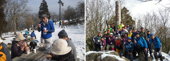 | 山頂には多くの雪が残っていました。休憩小屋の温度計は2℃前後を示していましたが、この時期の山頂の気温としては比較的暖かく感じられ、景色を楽しみながら山小屋の外で昼食をとる参加者も多くいました。 |