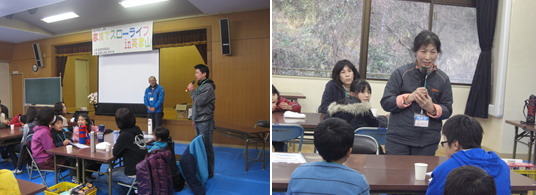 | 参加家族は、ほうとう作り、パネルシアター、昔遊び等を楽しみにして、JR彦山駅近くの彦山総合センターに集合しました。この事業を通じて知り合いになった家族同士が再会を喜ぶ姿が見られました。各家族の自己紹介では、「他の家族との出会いが貴重な財産となった。」「スローライフの春編・秋編での調理体験が家庭でも生かされている。」との声が聞かれました。田植えや稲刈りの話が出た時には、参加者の方々にたくさんの笑顔が見られ、和やかな雰囲気で活動を始めることができました。 |