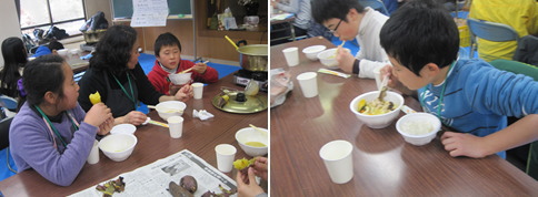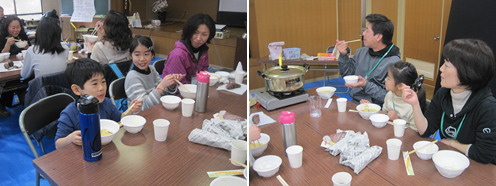 参加者は、家族で力を合わせて作った「ほうとう」を、おいしそうに召し上がりました。それぞれ上手にできていて、「おかわりを何杯もして、お腹いっぱいになった」との声が多く聞かれました。食材は地元の道の駅で購入したもので、地元で採れた野菜を地元で消費する「地産地消」のスタイルを実践しました。