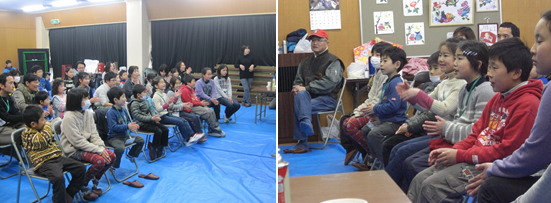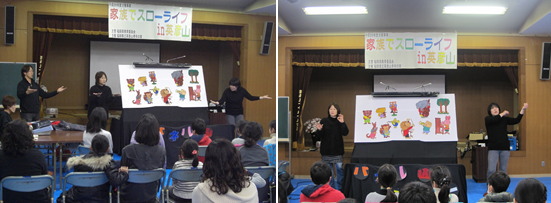 | 学習ボランティア「やまびこ」による、歌と光とパネルの出し物を鑑賞しました。7名の「やまびこ」さん達の出し物に大人も子どもも満足した様子で、「花咲き山がとても良かった。歌もとても楽しめました。」「にぎやかでとてもハッピーな気持ちになりました。」「アイディアいっぱいで楽しかったです。」との感想が聞かれました。 |