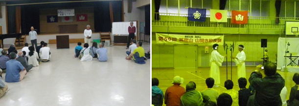 1日目は、講堂で「出会いのつどい」を行った後、青年の家体育館で添田町主催「英彦山山開き前夜祭」が行われ、参加者は、「まさかり舞い」や「山伏問答」「ジャズライブ」「英彦山踊り・英彦山ガラガラ節」等を見学しました。最後は、参加者全員で炭坑節を踊り、活気のある前夜祭となりました。