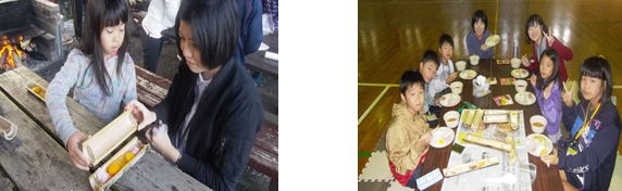 片づけ終了後、子どもたちは班ごとにバンブーエッグをつくりました。ほとんどの子どもたちが初めての体験で、竹の中に卵を入れ、水加減することに苦労していました。その後火にかけ、できあがった目玉焼きを美味しそうに食べていました。