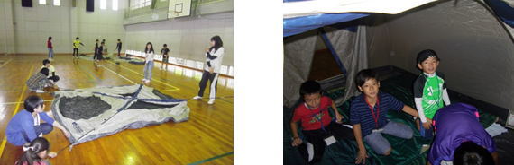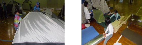 宿泊は、体育館でのテント泊でした。初めてテントで泊まる子どももいて、わくわくドキドキの様子でしたが、学生ボランティアを中心に、骨組みやシュラフづくりなどを班で協力してテント設営をすることができました。