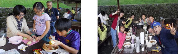 1日目の夕食は、カレーライスをつくりました。はじめにスタッフから、鉈や包丁の使い方、火傷に注意することの安全指導を行いました。その後、各班で火をおこしたり、食材を切ったりするなどの分担を決め、子どもたちはきちんとその役割を果たしました。また子どもたちの中には、進んでいない仕事を手伝う姿も見え、協力することの大切さを学ぶことができました。