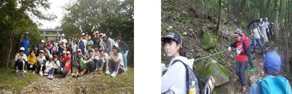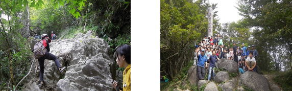 | 朝食後、キャンプ最大のイベントである英彦山縦走登山にチャレンジしました。この登山は、小学生の宿泊学習では体験できない困難克服体験の一つの活動として取り入れました。子どもたちは、つどいの広場に集合し、登山についての説明を聞き、各班で写真を撮ってから出発しました。途中大きな石がある山道やロープ、鉄鎖がある崖を登りました。また、きつそうな表情をしている仲間に「がんばろう!」「ファイト!」などと声を掛け合い、励まし合いながら登頂を果たしました。山頂で撮った写真は、やりきったという表情でいっぱいでした。帰りは北西尾根コースを通り、はしごを使ったり、ロープづたいに急坂を下りたりと険しい道を懸命に歩きました。青年の家に帰着した時は、子どもたちは達成感で満ち溢れていました。登山をとおして、何事にもあきらめずにやりとげるチャレンジ精神や仲間を思いやる大切さを学ぶことができました。 |