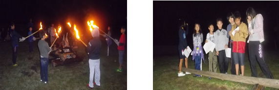夜の活動はキャンプファイヤーを行いました。少し肌寒い中、みんなで火を囲み、火のありがたさを伝える儀式を行ったり、各班で準備したクイズや歌などの出し物を披露したりしました。このキャンプファイヤーとおして、子どもたちの交流が更に深まりました。