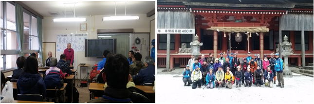 講師や青年の家スタッフのあいさつ後、大野和幸氏から雪山歩行について話をしていただきました。参加者の中には、初めて雪山を歩く方がいて講師の話に注意深く耳を傾けていました。また、今回は史跡散策も行い、植田周平氏に詳しく説明していただくことにしました。今回は天候不良のため、当初の予定より短いコースを設定し、参加者に楽しんでいただこうと企画しました。