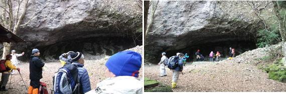 玉屋神社到着後、植田氏より玉屋神社について説明をいただきました。玉屋神社は英彦山最古の窟で、修験道の「中興の祖」と言われる法蓮上人が修行のために使っていた場所であり、また不老長寿の霊水が湧いていると話をしていただきました。