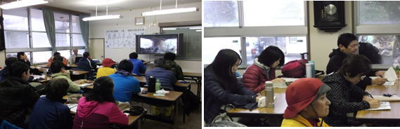 | 帰る途中に雨が降り、花駅への帰着を急ぎました。昼食休憩をとった後、植田周平氏により英彦山の自然と歴史について講話をいただきました。講話の内容は、訪れる予定にしていた鬼杉や梵字ケ岩、大南神社などの史跡について、しゃくなげやオオヤマレンゲなどの英彦山周辺で観察できる希少植物について話をしていただきました。参加者は積極的にメモを取りながら、講話に耳を傾けていました。 |