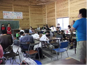参加者は、英彦山の麓に位置する上津野地区地域活性化センターに集合し、「出会いのつどい」を行いました。参加家族からは、「自然の中での活動を楽しみしています」「田植えが楽しみです」などの言葉が聞かれました。 |