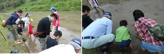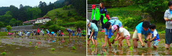 | 参加者は、上津野地区男性部の方々から3~5本ずつの苗を植えていくことを教わり、水田に入り苗を植えました。初めて田植えをする方が多く、最初は泥の感触に戸惑ったり、足を取られたりしてぎこちない動きでした。上津野地区の方々のユーモアを交えた指導もあり、楽しく田植えをする姿が見られました。参加者も次第に田植えに慣れていきどんどんスピードアップしていきました。みんなで植えた苗を、9月に収穫する予定です。 |