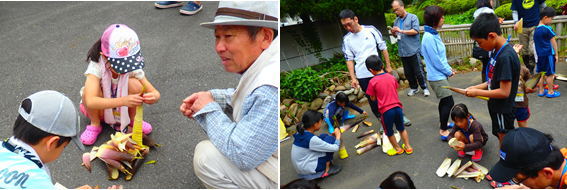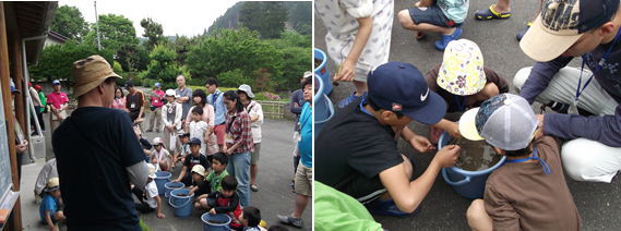 | ↑子どもたちに指導する上津野村づくり協議会会長 |
