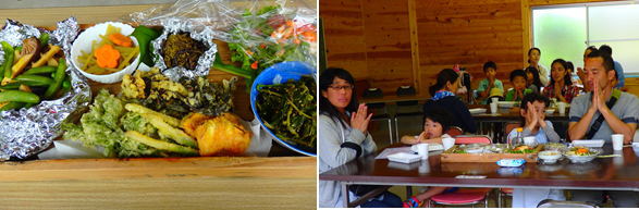 | 郷土料理体験では、たけのこの皮むきを行いました。調理済みのたけのこを見る機会が多い子どもたちは、幾重にも重なったたけのこの皮に驚いている様子が見られました。ゆであがったたけのこは、参加者の皆さんのお土産になりました。料理体験後は、上津野地区女性部のみなさんに朝早くから準備していただいた「うど」「ふき」「たけのこ」などを使った山菜料理に舌鼓を打ちました。メニューは「ふき、わらびのうま煮」「山菜の天ぷら」「たけのこ御飯」「新タマネギのサラダ」等で、どれもおいしくいただきました。 |