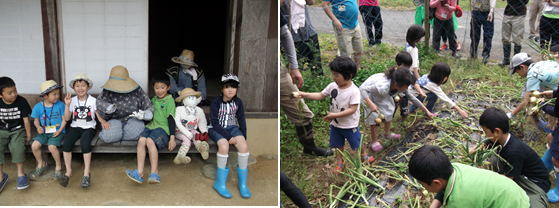 | タマネギ収穫体験前に、1842年に建築された国指定重要文化財の数山(すやま)家の見学をしました。昔の農家の佇まいに、参加者のみなさんは驚きの声を上げていました。見学後にタマネギ畑で何百本もあるタマネギを子どもたちがどんどん抜いていき、タマネギもあっという間になくなりました。 |