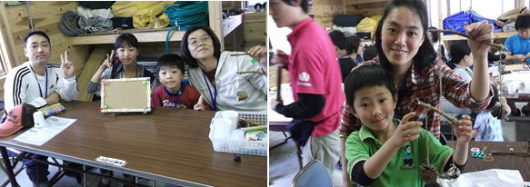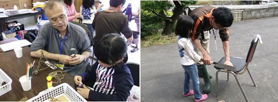 | 最後の活動は、英彦山の自然の材料を使った「森のイーゼル(写真たて)」「森のモビール」の2種類のクラフト作りをしました。枝や木の実などの材料をどのように組み合わせるのかを家族で相談しながら作品づくりに取り組みました。初めてノコギリやキリなどの工具を使う子どもたちも多く、家族で協力して材料を加工していきました。短い時間でしたが工夫を凝らした素晴らしい作品が出来上がりました。 |