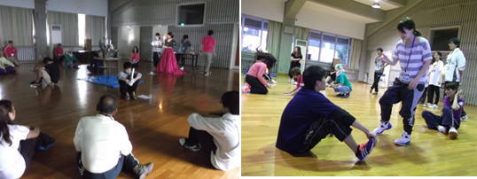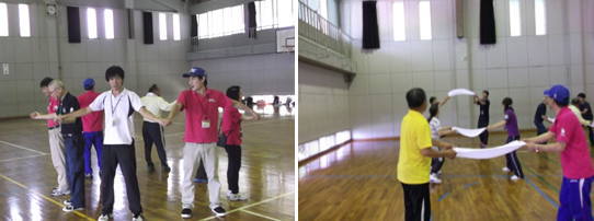 集団づくりに生かせるレクリエーションの指導方法を理解していただくために、演習を行いました。ここでは、実際にレクリエーションを体験し、活動の進め方や効果的な人間関係作りについて学べるように進めました。まず、参加者同士の緊張をほぐすために、命令ゲーム、じゃんけんゲーム、手遊びなどを行いました。次に、参加者同士が仲良くなるために、ペアやグループになりやすい環境づくりができる、みんなでじゃんけんゲーム、自己紹介ゲームなどを行いました。最後に、グループで協力して、向かい合った2人がタオルにぬいぐるみを乗せて、次のペアへぬいぐるみをリレーするタオルリレーなどを行いました。活動が進むにつれ、参加者は笑顔や会話が増え、レクリエーションの効果を実感していただきました。