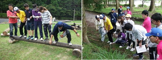 | ↑丸太の上で指示のとおりに並びかえる参加者 |