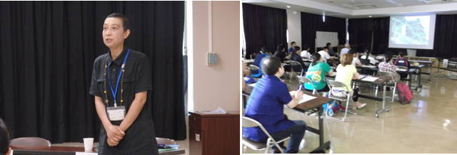 参加者が現在の河川環境問題や環境保全活動に対する関心と意欲を高めることができるように、豊の国海幸山幸ネットの田中敦子先生に講話「祓川における環境保全の取組について」をしていただきました。田中先生は、祓川の景観を守る取組に興味を持ってもらうために、紙芝居や絵地図等を作成したり、イベントを企画したりする活動について、DVDを使いながら説明されました。また、英彦山は福岡県の各地域を流れる川の源である「水分の山」として、福岡県の環境シンボルであることについても話されました。参加者は、祓川における水環境の現状や河川環境を保全するための取組について学びました。
