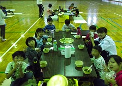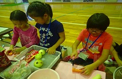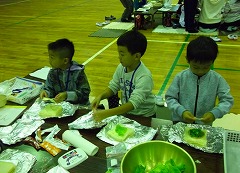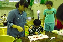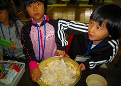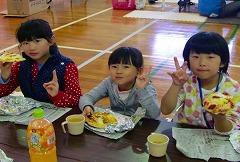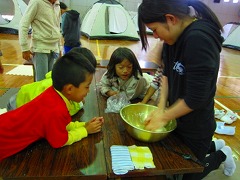 アイスブレイク終了後、おにぎりづくりにチャレンジしました。初めておにぎりをつくる子どもたちも多く、なかなか上手くできませんでした。しかし、学生ボランティアに丁寧に教えてもらいながらつくっていくと三角や丸の形をしたおにぎりを完成させることができました。その後、自分たちがつくったおにぎりをおいしそうに食べていました。この活動は、自分のことは自分でする大切さを知るきっかけづくりになりました。