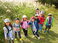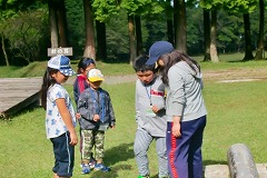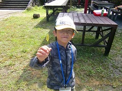 朝食の後は、日ごろあまり意識することのない自然の様子を注意深く観察するために、青年の家の前の杉林やピザ釜場周辺の広場で自然観察ゲームを行いました。子どもたちは、スタッフが事前に見つかりにくい状態で自然の中に置いた文房具などの人工物を探す「カモフラージュ」や見本と同じ草などの植物を探してもってくる「同じものを見つけよう」等を体験しました。この活動を通して、子どもたちは英彦山の自然に触れたり、英彦山に生育する植物を観察したりすることができました。