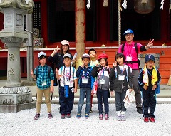 昼食を食べた後、英彦山の自然や歴史に触れるために、班ごとに英彦山探検に出かけました。青年の家から奉幣殿までの道のりを写真やコース図を頼りに班で協力して、チェックポイントの問題を解いて歩きました。後半になると、疲れた友だちに優しく声をかけて励ますなど、活動を通して班の絆を深めることができました。