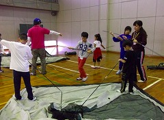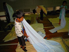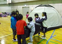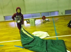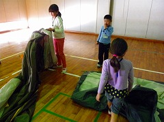 テント泊をするために、テント張りを行いました。このテント張りは、友だちと協力することの大切さを知ることになります。初めてのテント泊にわくわ くドキドキする子どもたちが多く、学生ボランティアと一緒に、班で協力してテント張りをすることができました。また、シュラフの準備では、一緒に寝る友だちと助け合いながら用意することができました。