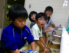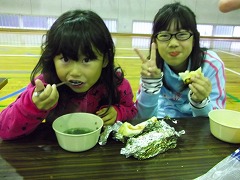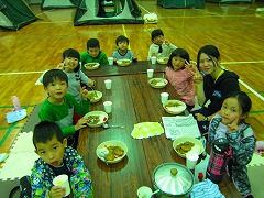 夕食のために、「ハンバーグカレー」をつくりました。どの子どもたちも、初めて使う包丁や皮むき器などの道具を安全に使いながら調理することができました。食後の片づけでも、狭い洗い場を譲り合いながら使う姿が見られ、同じ班の中だけでなく、他の班の友だちとも協力して活動することができました。