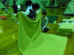 テント泊で使用した道具を片づけるために、起床後すぐにテントを撤収したり、毛布やシュラフをたたんだりしました。子どもたちは、学生ボランティアに手伝ってもらいながら、友だちと協力して片づけや自分の荷物整理を行うことができました。